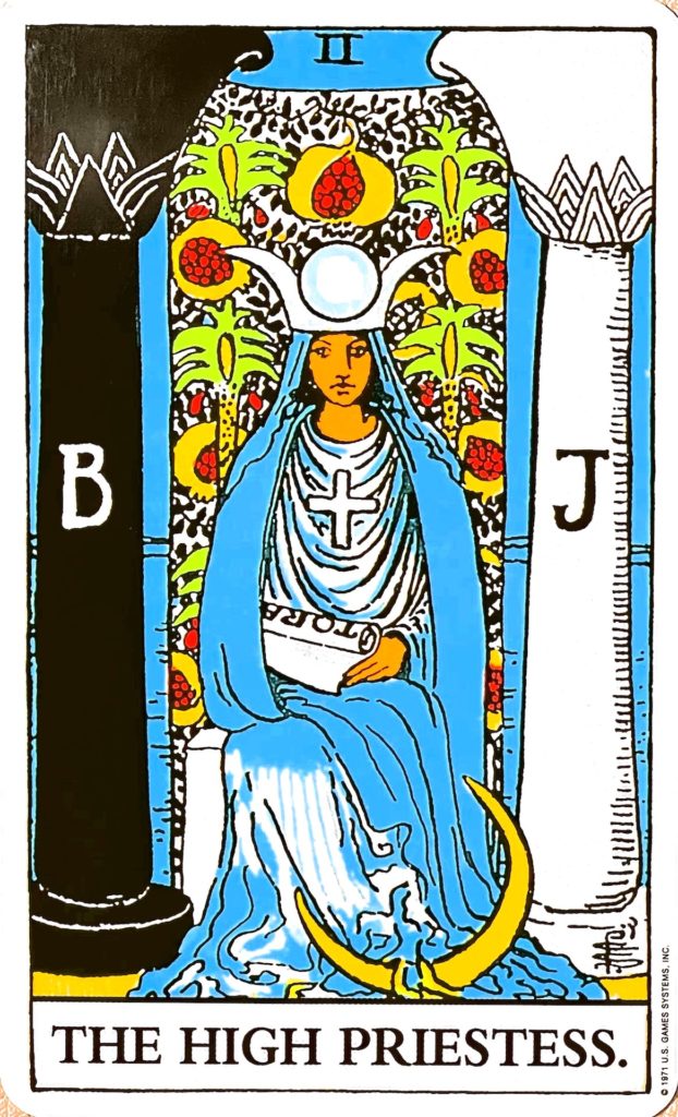 深い考えや聡明さを表すカードです。深い思慮と洞察力で、ものごとの本質を見抜くことを表すとされています。青い衣は精神性の高さ、巻物(「TORA」という律法書)は知恵や知識、十字架は人のためになることを表しています。また、背景に2本の白と黒の柱が描かれていて、ヘブライ語でBは「闇〈BOAZ:ボアズ〉」、Jは「光〈JACHIN:ヤヒン〉」です。酸いも甘いもかみ分けて現実的に見ることを表しています。ザクロは女性性を表し、青い海は冷静さを表しています。