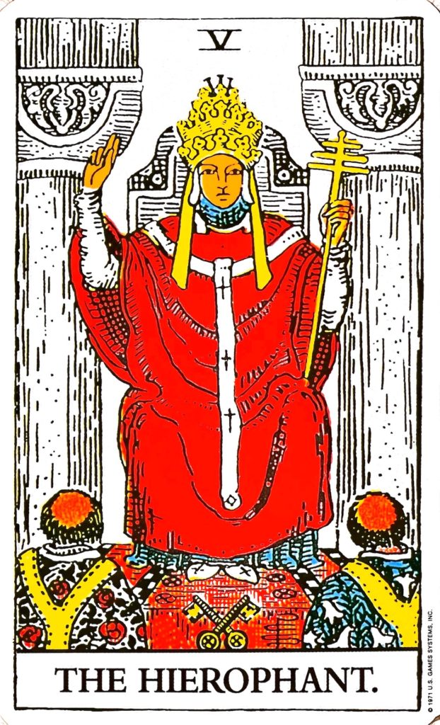 道徳(モラル)のカードです。また、教え導くことや、ルール、社会性のカードでもあります。左手に持っているのは十字架を3つつなげた杖で、真理や霊的なつながりを表しています。右手は、神への忠誠を誓うポーズで、赤い衣は熱意を表しています。2本の柱は、神の世界と人間の世界をわけていて、足もとには天国の門を開く鍵があります。二人の聖職者は双子で、人間の二面性を表し、バラ柄の衣は現実の厳しさを、ユリ柄の衣は現実に染まらない純粋さを表すとされています。