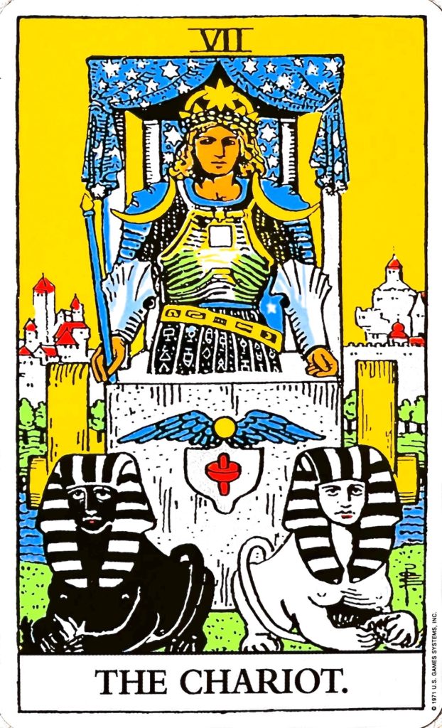 勝利に向かって突き進むカードです。戦車に乗った若者が描かれています。若者は、手に杖を持ち、一時的な気力を持っていることを表しています。若者の冠にの星は理想や目標を、着ている鎧の胸当て(アロンの胸当て)にある四角は勝利を、肩当ての月は不安定さを表します。2頭のスフィンクスは、白色と黒色で、理性と本能のバランスを表します。戦車にある有翼円盤は、古代エジプトでは太陽、つまり王(ファラオ)を表し、コマは一時的な衝動を表しています。天蓋の星の模様は、理想や目標、希望を表します。背景の城は、若者の生家です。