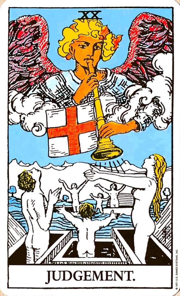 復活のカード、再生のカードです。決断のカードでもあります。天使がラッパを鳴らし死者が蘇る絵柄は、新約聖書のヨハネの黙示録に記されている最後の審判がテーマだとされています。生前善い行行いをした人々は永遠の命を授けられ、悪い行いをした人々は地獄へ落とされるのが最後の審判ですので、これまで努力をした人々は救われることを意味しています。天使は、大天使ガブリエルで、天からの言葉を告げています。ガブリエルは、聖マリアがイエス・キリストを授かった受胎告知をした天使です。天使のラッパは天からのお告げを表していて、赤十字の旗は救済を表します。棺から蘇る人々は3人が一組で描かれていて、地上における三位一体を表すとされ、新しく生まれ変わることや物質的な価値観から解放された精神性を表すとされています。