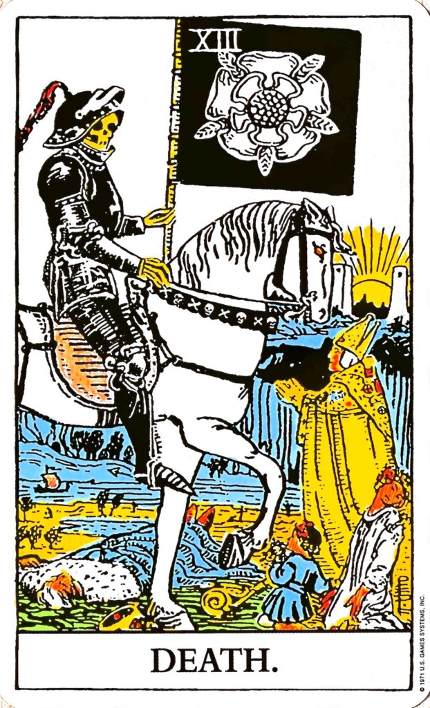 何かが終わって、新しい何かが始まるカードです。死と再生を意味します。骸骨姿で鎧を着た死神が描かれており、終わりを告げています。死神のカードは、そのまま死を表す場合もまれにありますが、たいていは何か物事が終わることを表しています。白い花の紋章は生と死の神秘を表し、白馬はごく自然な「終わり」を表します。川と船は、左から右に流れていることから、過去から現在へ流れていることを表します。太陽は、再生を表しています。