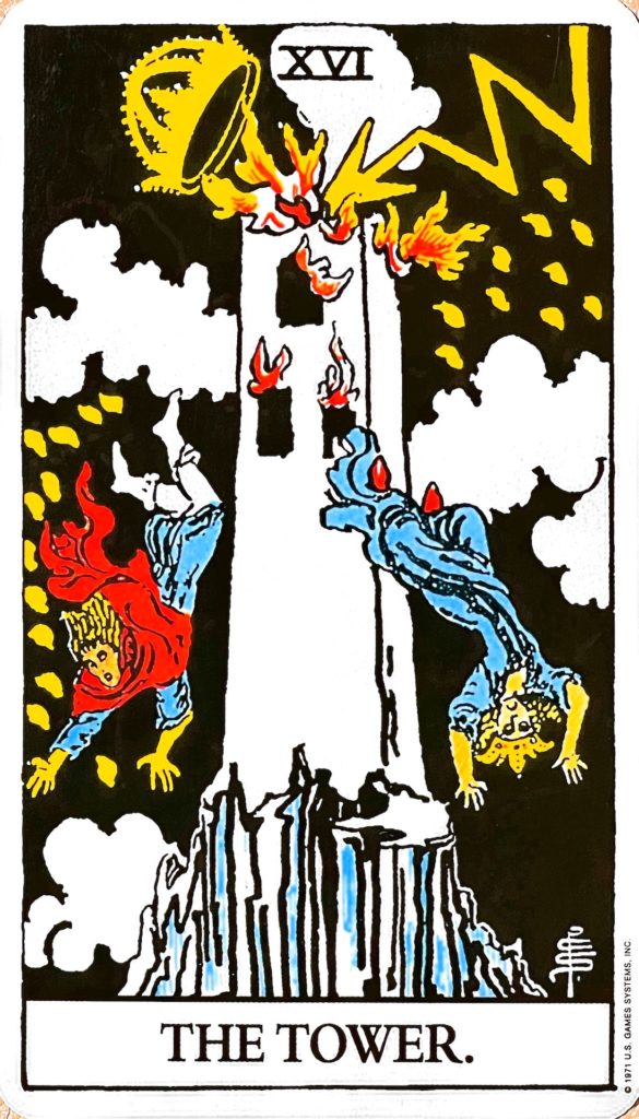 思ってもみないことが起こることを表すカードです。塔は、旧約聖書に登場するバベルの塔で、古代バビロニアの聖塔を表すと言われています。雷は、天からもたらされたもので、警告の意味と、ひらめきの意味があります。落ちる王冠は、今まで築いてきたものが崩れる、絶対変わらないと思っていたことが変わることを表します。火の粉は、大アルカナの枚数と同じ22個で、ヘブライ語のヨッドの形になっていることから、天からの力を意味するとされ、希望でもあると言われています。塔から落ちる男女は、魔術師と女教皇とされ、転落や失墜を意味していて、これまで秘密にしていたことが明らかにされることを表しています。