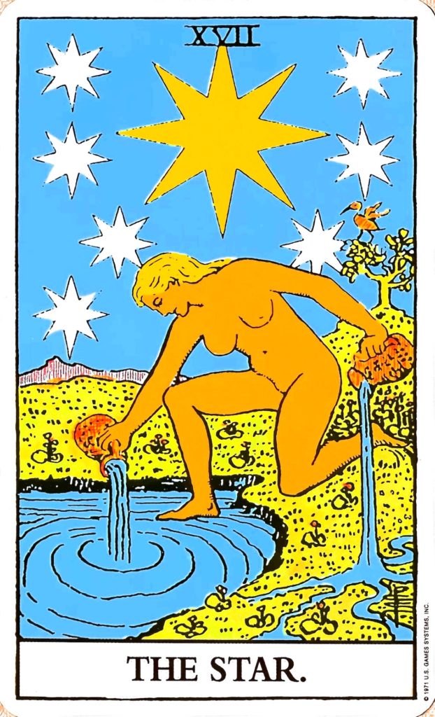 希望のカードです。隠された能力を活かすことも意味します。裸の女性は、左足を大地に、右足を水につけています。大地は現実世界や顕在意識を、水は感情や潜在意識を表します。両手に持った水瓶で大地と水に生命の水を注いでいて、大地に流れる5本の水の流れは五感を表しています。大きな星と小さな7つの星は8芒星になっていて、8芒星は宇宙からのエネルギーを表しています。背景に描かれている木にとまっている鳥は鴇(トキ)で、再生する鳥という意味合いから希望を表し、エジプト神話の知識の神トートであると言われています。