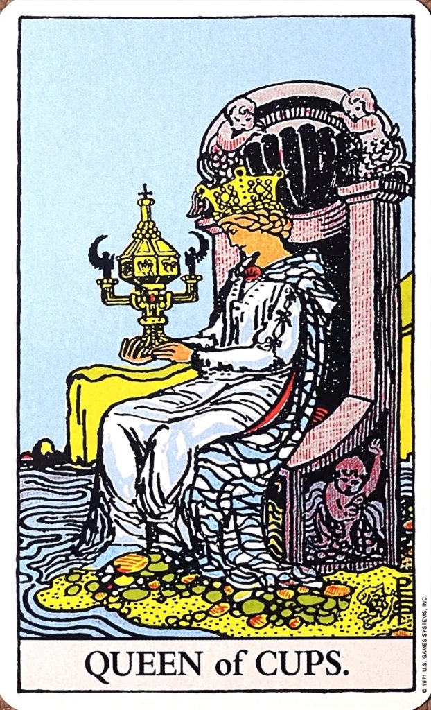 深い愛情のカードです。大きなカップを持った女王が、玉座に座っている様子が描かれています。その大きなカップは、愛情や包容力の大きさを表しています。女王はそのカップを眺めていて、どうすればこの世をもっと愛で満たせるかを考えています。女王のドレスは水と同化していて、大地とも接していることから、感情や潜在意識が自己と統合されて、現実とつながっていることを表します。また、玉座には子どもの人魚や貝、魚といった水のエレメンタルに属するモチーフが彫られていて、愛情や受容を表しています。
