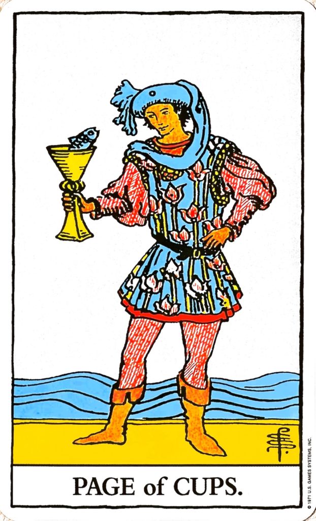 愛される人物のカードです。よい発想やインスピレーションを表すカードでもありますし、遊び心を表すこともあります。カップを持ったペイジ(騎士見習い)が描かれていて、そのカップから魚が顔をのぞかせています。カップから顔をのぞかせている魚は、水が感情や感受性、潜在意識を表し、魚はそこから出てきている価値があるものを意味しますので、いいアイデアやユニークな発想が出ることを表しています。また、ペイジは微笑んでいて、素直に楽しんでいる状態を表します。また、ペイジの服は睡蓮の柄で、純真で清らかな心を表しています。背景の波はなめらかに波だっていて、水は感情や潜在意識を意味しますので、ワクワクした気持ちや希望に胸を躍らせていることを表します。