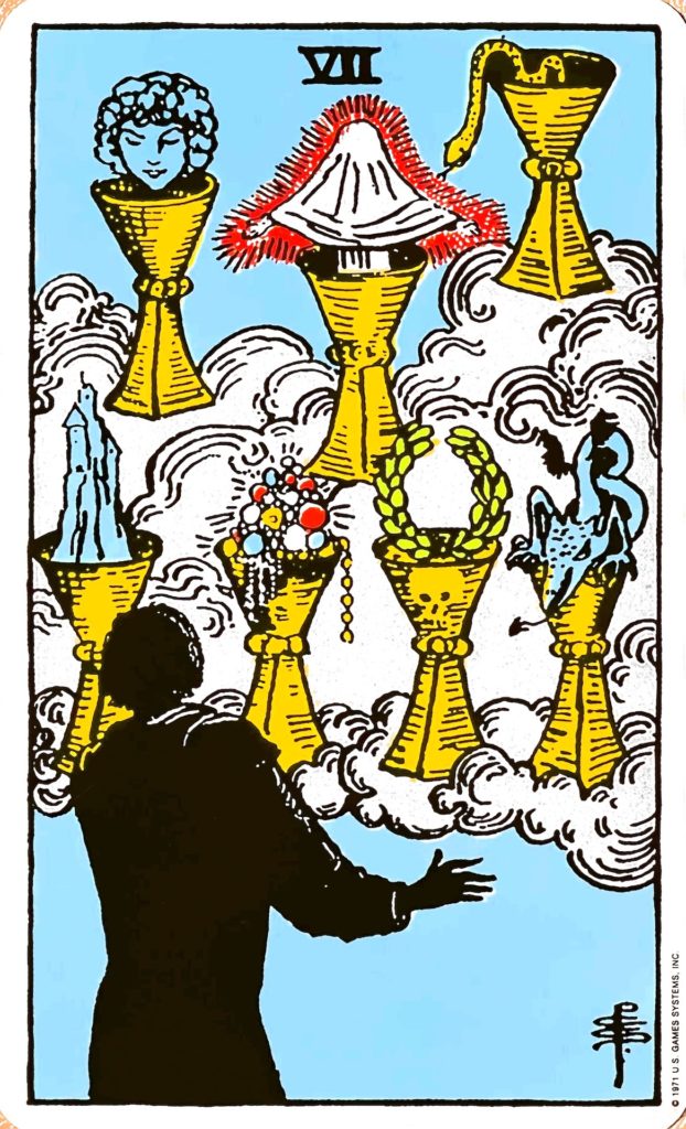 理想や空想に浸っているカードです。7つのカップが雲の上に浮かんでいて、黒色の人物がそれを見ている様子が描かれています。7つのカップにはそれぞれ、お城(権力)、宝石(富)、月桂冠(栄光)、竜(力)、蛇(知恵)、布を被った人(徳、聖)、人物の顔(パートナー、恋愛)が乗っています。これらのカップは雲に浮かんでいますので幻想であることを表しています。また、黒い人物のシルエットは、黒色が行き詰まりや警告を意味しますので、本来の自分や現実を見失っている状態を表します。いろいろな欲望から幻想に浸ってしまっていることを警告しているカードです。