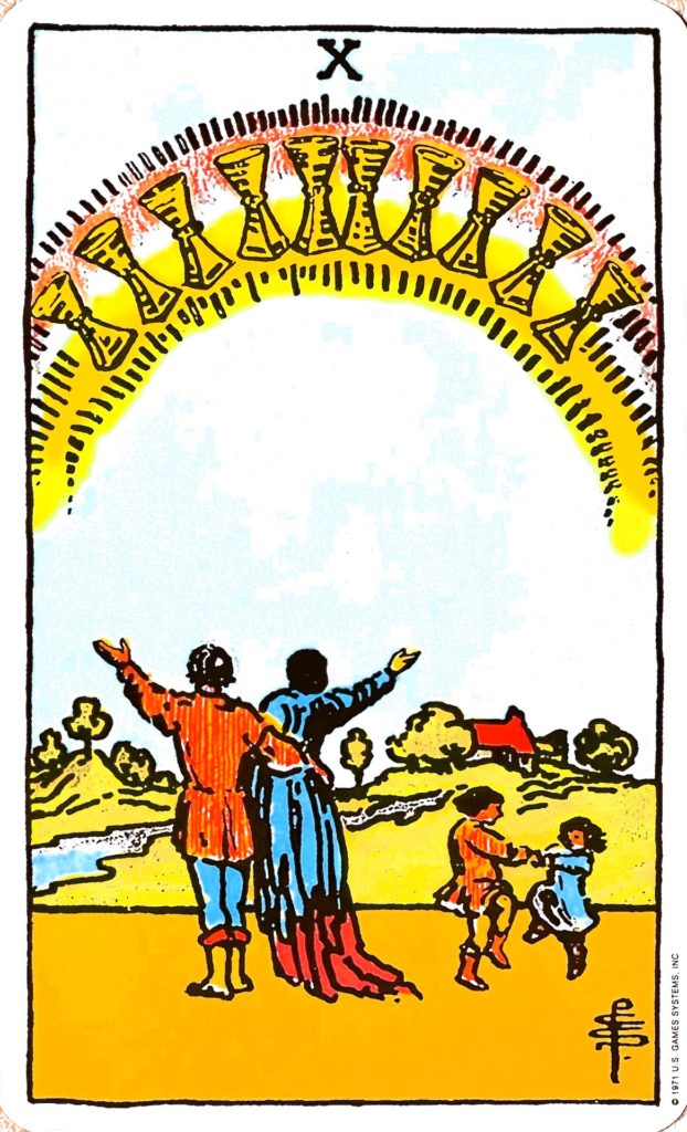 幸せな日常がやってくるカード、幸せな家族のカードです。空には大きな虹が架かっていて、虹は希望や幸せを表しています。その下には、手で空を仰いでいる男女がいて、同じポーズをとっていることから調和を表し、これまでの苦労や努力が実を結んで愛と幸せがある生活を手に入れたことを表しています。その横には両手をとって踊る2人の子どもたちがいて、純粋無垢な喜びを表します。その向こうには家があり、心から安心できる場所があることを表しています。