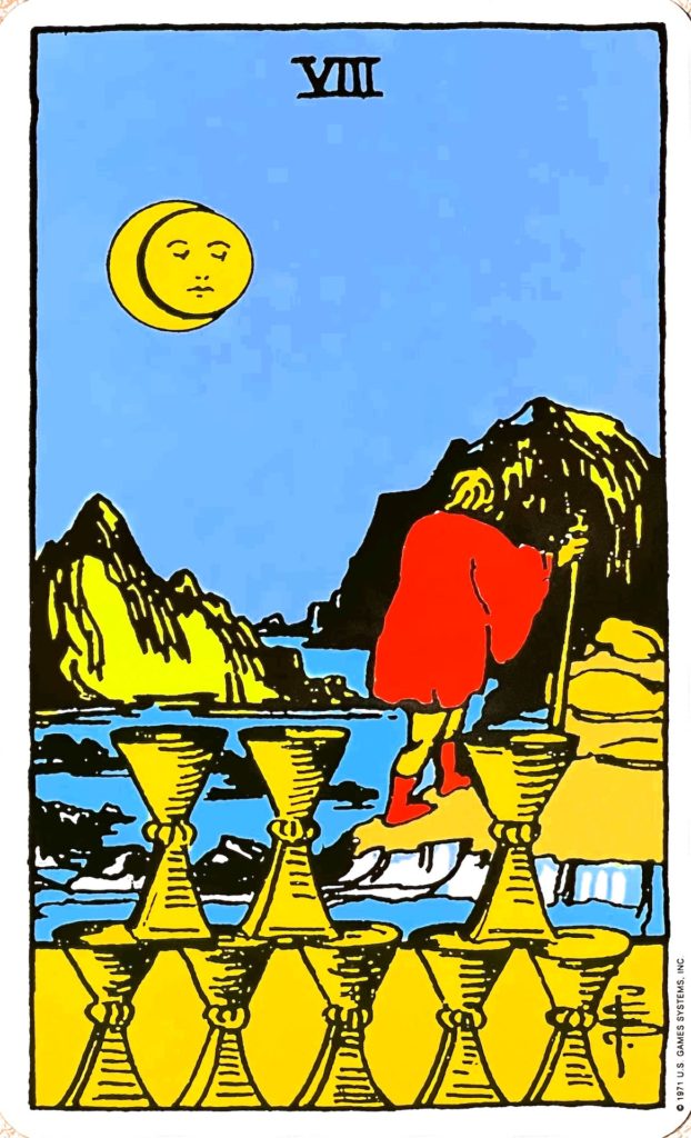 卒業のカード、レベルアップのカードです。移動を表すカードでもあります。まだ心残りはあるかもしれませんが、その気持ちを振り切って新しい場所へと旅立っていく様子が描かれています。手前にカップが8個積み上げられていますが、そのカップに背を向けて旅立っていく人物がいます。8個のカップは、これまで積み上げてきたたいせつなものを表します。そして、カップに背を向けて旅立っていく人物は、今まで積み上げてきたたいせつなものを手放して新たなことをしたり、新しい場所に行くことを表しています。その人物の服は赤色で、熱意があることを表しています。月は、その形を変えていくことから、心境の変化を表します。背景の険しい山は、試練や修行、より高い目標を表しています。