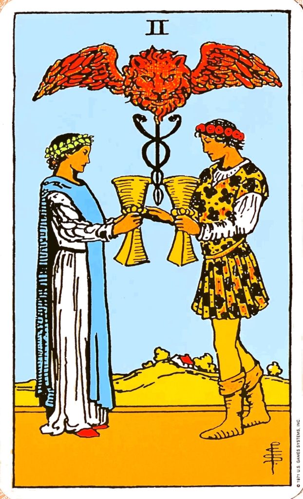 いい関係のカードです。調和のカードでもあり、友人関係も恋愛関係も表します。二人の人物が手を取りあいながら、カップを持っている絵柄が描かれています。左側が月桂樹の冠(勝利や栄光の象徴)をかぶった女性で受容性を表し、左側が薔薇の冠(情熱の象徴)をかぶった男性で一歩踏み込んでいることからも能動性を表し、その調和がとれていることを表しています。その上には、2匹のヘビが巻きついていて翼がはえたライオンがあるヘルメスの杖(カドゥケウス)は、陰と陽など異なる2つのものが交わってより高い次元へ向かうことを表しますし、意思を伝えることも表しています。また、翼がはえたライオンは聖マルコ(イエス・キリストの生涯と教え「マルコによる福音書」を書いた聖人)を表すともされています。なお、翼があるライオンが聖人マルコを意味するようになったのは、迫害を避けるためにキリスト教徒にしかわからない表現に使っていたためだと言われています。背景の家は、将来この2人が暮らす家になるのかもしれませんが、遠くにあることから、この2人の関係がまだはじまったところであることを表しています。