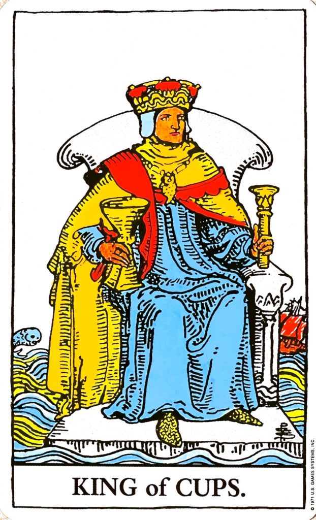 広い心のカード、寛大さのカードです。また、そうした人物を表す場合もあります。水に浮かぶ玉座に王が座っていて、背景には魚や船が描かれています。王のカップは大きく、心が広いことを表しています。また、王が持つ短い笏(しゃく)は、権威を表しています。魚のペンダントをつけていて、潜在意識を現実のものとして身につけられていることを表します。水面は波だっていますが、玉座は揺るがすしっかりとしていますので、優しさや喜びなどの肯定的な感情だけではなく、あらゆる感情を受けとめても心が安定している状態を表します。背景の魚や船も、荒波をものともしていない様子で、さまざまな感情にあっても、ものともせず、情熱をもって進むことができることを表しています。心の底に色んな感情があっても、それを意識しつつしっかりと安定して、心を広くもつことができていることを表します。