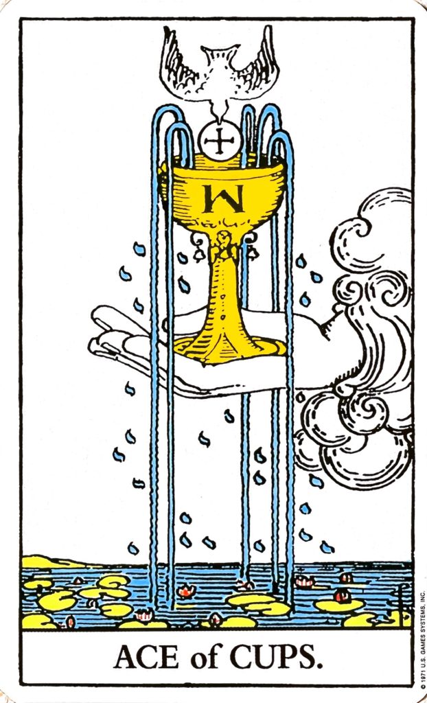 愛の始まりのカードです。右側から手がカップを手のひらの上に置いている絵柄が描かれています。雲から伸びている手は高次元の意識を表し、カップは天からの愛や贈り物(ギフト)を意味していますので、天からの贈り物を受け取ることを表しています。左は過去を、右は未来の方向を意味しますので、未来の始まりを表します。カップにはMを逆さにした文字があり、Mはヘブライ語で「メム:水」を意味し、水は感情を象徴します。カップから流れる水は5本あり、五感を表すともされていますし、命の水だとも言われています。その水は、潜在意識を表す下にたまった水にあふれています。その周囲の水滴はヘブライ語の「ヨッド」の形で、天からの恵みを表します。その水たまりには蓮の花や葉っぱが浮かんでいて、蓮は永遠の命や再生を表します。カップの上の十字マークが入ったパン(聖体:ホスチア)をくわえた白い鳩は、天からの贈り物を運ぶ聖霊で、純粋で無垢な心を表します。