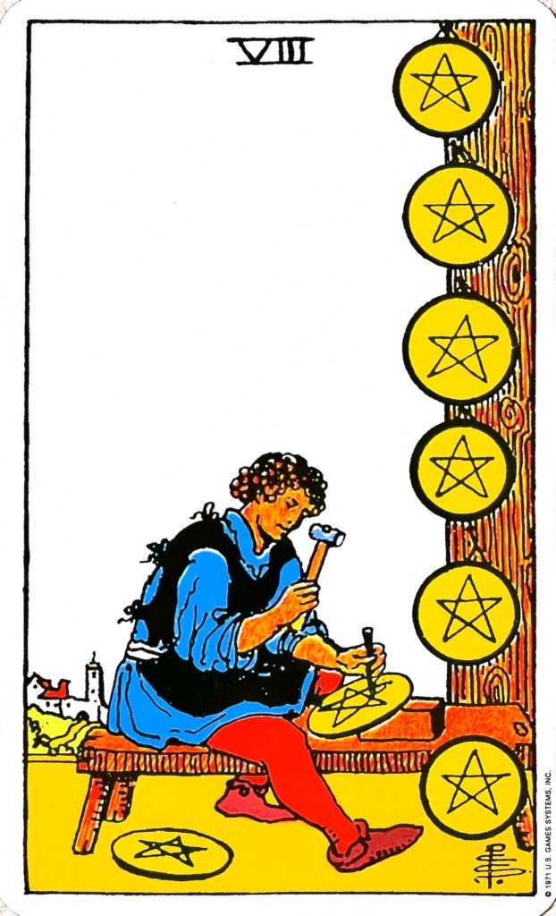 地道に取り組むカードです。職人がペンタクルを作っている様子が描かれています。この職人の青い服は成長を、黒い前掛けは秘密の技術や知識を、赤いタイツは情熱を表します。この職人は見習いであると言われていて、勤勉に仕事に打ち込んで、一人前になることを目指している姿を表しています。遠くに見える街は、この職人が将来活躍する場所(目標)なのかもしれませんが、まだ距離があるようです。リーディングによっては、この職人の姿から、専門職や専門的な知識を意味する場合があります。