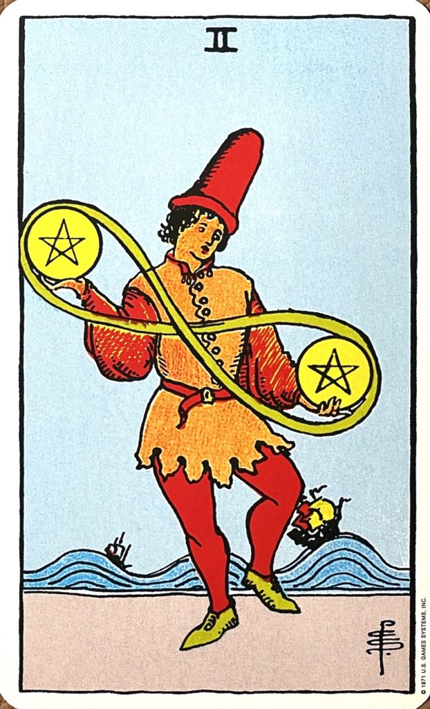 器用に、柔軟に物事をこなすカードです。楽しみながら物事をこなすという意味合いも持ちます。大道芸人が、ふたつの金貨を無限大の形に器用に操っている様子が描かれています。ふたつの金貨は、無限大のマーク(レムニスケート)の形になっていて、繰り返すという意味合いを持ちますので、収入と支出、成功と失敗などを繰り返し行うことを表しています。金貨を操っている大道芸人は動きが軽やかで、楽しみながらやるとこ、気晴らしをするなどの意味合いを持ちます。大道芸人の服は赤色やオレンジ色で、熱意を持っていることを表しています。背景には、大きくうねった波を船が右方向(未来)へと向かっていますので、感情の浮き沈みや状況の不安定さがありつつも、柔軟に対応して未来に向かっていくことを表しています。人生は山あり谷ありで、成功もあれば失敗もあり、浮き沈みがあるものですが、それを楽しみながら、器用にこなしていくことを表します。