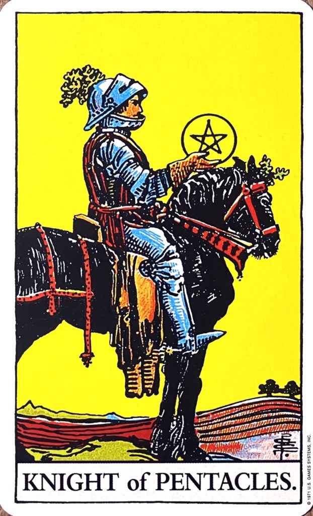 地道な努力によって成果が期待できるカードです。ペンタクルを手にした騎士が描かれていますが、騎士はペンタクルを見ておらず、遠くのほうを見ています。これは、お金や地位などの物質的なものによって得られるその先の物事を見ている、真剣に考えていることを表しています。騎士が乗っている馬は黒色で赤色の馬具をつけていていることは、黒色が秘密を、赤色が情熱を意味しますので、情熱を秘めていることを表します。また、馬が止まっているのは、あえて歩みを止めて慎重に堅実に物事を進めようとしていることを表しています。背景の畑は、耕されていますが、まだ作物は実っていませんので、まだ成果はなくても、これから成果を得る準備ができていることを表しています。