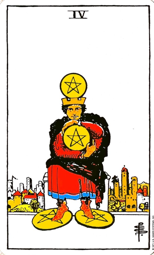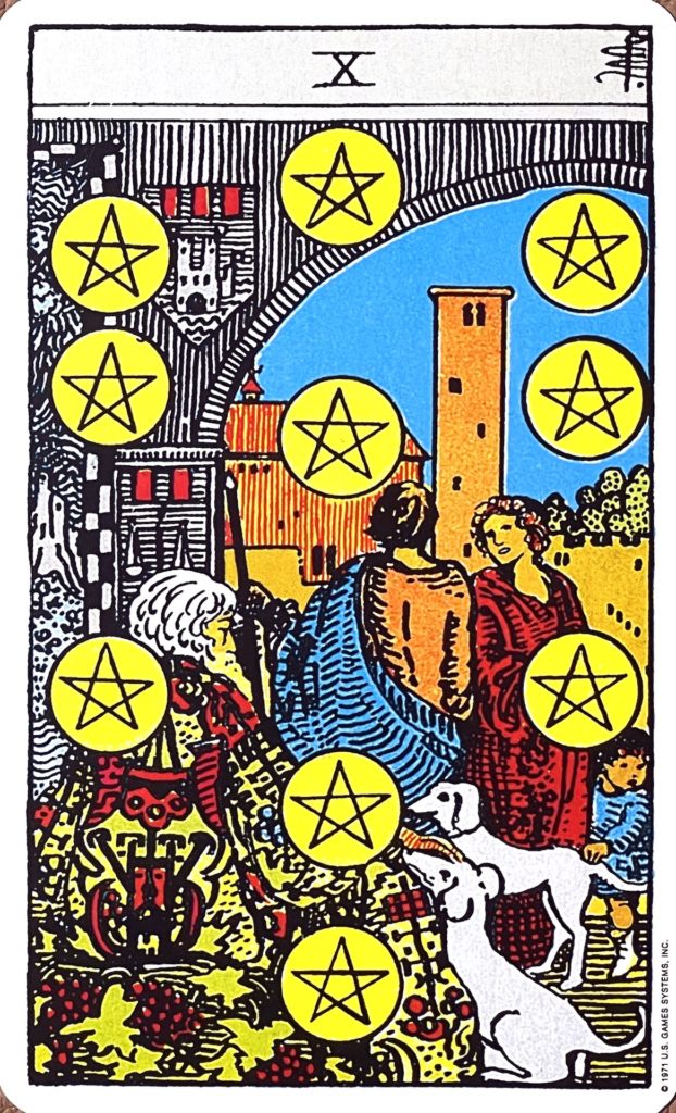 富や地位など、物質的な成功や安定を表すカードです。豪華な衣装をまとった老人と、男性と女性、子ども、二匹の犬が館にいる様子が描かれています。ここに描かれている人たちは家族、一族とされていて、お金や技術、知識などが受け継がれていくことを表すとされていますが、必ずしも家族関係を表すものではなく、友人や職場、学校の人たちを表す場合があります。男性は左手にワンドを持っており、老人から権威を受け継いだことを意味し、完成(老人)から新たな始まり(男性)を表しているかもしれません。二匹の犬は、人生の友やパートナーを表しています。左下に描かれているブドウは成果や富を表しています。また、石造りのアーチや背景にある大きな館は、これまで積み上げてきた物質的に価値があるもの(富や財産など)を表します。なお、ここで描かれているペンタクルは生命の樹の配置になっていて、完成と始まりを意味しています。