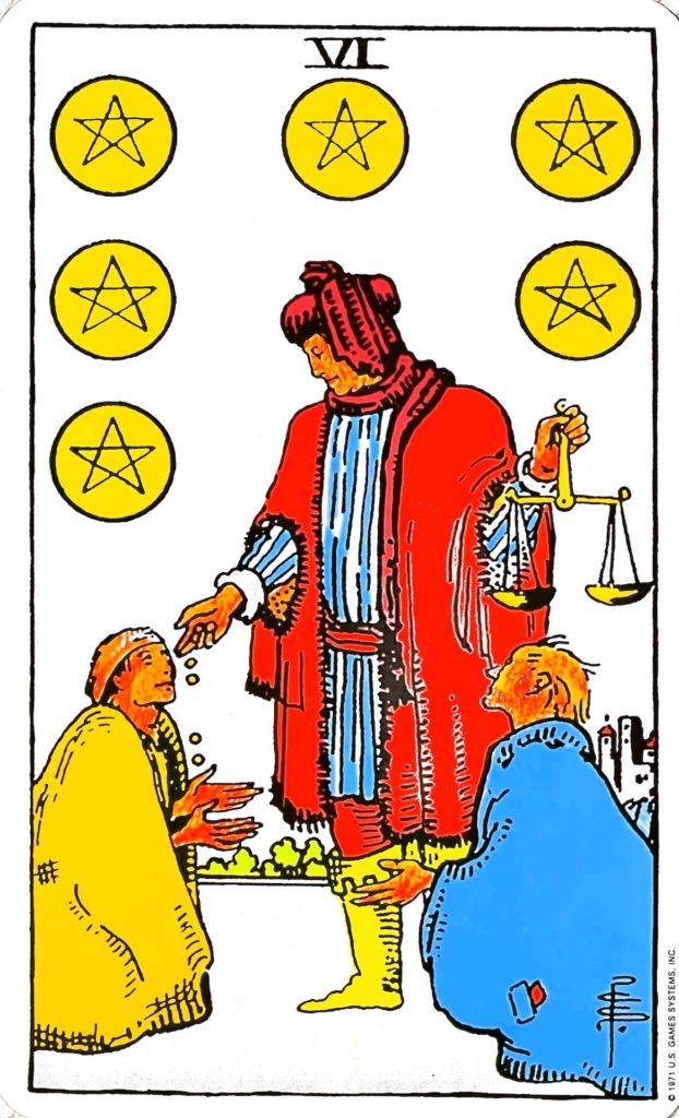 助け合いのカードです。商人風の人物が、天秤で測りながらお金を分け与えている様子が描かれています。商人風の人物は、豊かさや成功を表しています。天秤は、平等さを意味していて、助けを必要とする人に必要な分だけ手助けをすることを表しますが、名声などの見返りがあることを表すともされています。ほどこしを受けている右側の青い服を着た人物は、ポケットに赤色の何かが入っていて、これが欲望を意味するとされ、貧乏なふりをしてお金をもらおうとしていると言われていますので、お金をもらうことができていません。一方、左側の黄色い副業の人はお金をもらうことができています。これは、困っているふりをしていると、それを見抜かれることを表しているとされています。背景の街は、商人風の人物が、成功した街であるとか、昔はほどこしを受けた街だとされています。