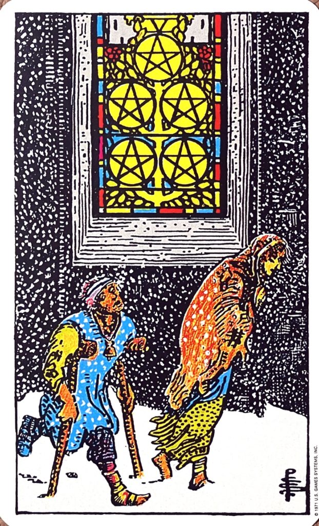 行き詰まるカードですが、救われる道はあるという意味合いも持つカードです。二人の物乞いが、教会の前を歩いていますが、その後ろの教会の窓は見ていません。この物乞いは、中世ヨーロッパでも差別されたハンセン病を患っている男性と、物乞いの女性が描かれています。また、教会のステンドグラスの窓は描かれていて、希望や救いを意味する黄色で主に描かれていますが、扉は描かれていません。こうした絵柄から、リーディングの仕方については説が分かれています。この二人はどうにもならない状況に行き詰まっていて差別などがあり教会(社会)も助けてくれないとリーディングするのか、あるいは、この二人は後ろの教会に気づいていないので教会があることに気づきさえすれば救われる道があるとリーディングするのか、プライドが邪魔して教会に助けを求めることができずにさまよっているとリーディングするのか、読み方が分かれるカードです。また、二人でいることから、つらい状況であっても一緒にいてくれる人がいるとか、同じようにつらい状況にいる人もいるなどとリーディングすることもあります。