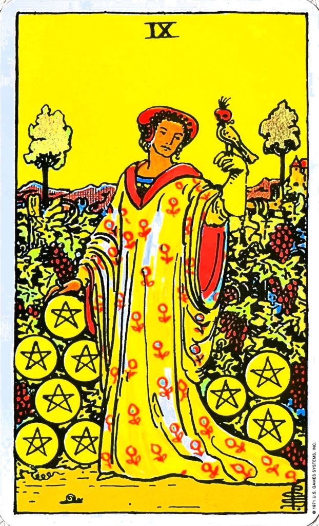 成果を手にするカードです。成果は、努力が実ることを意味する場合もあれば、お金を得ることを意味する場合もあり、物質的な成果を表しています。カードの左側から金貨(ペンタクル)を持った手が出ている絵柄が描かれています。雲から出ている手は、高次元からの意識を表します。この手は金貨をつかんではいなくて、手のひらで受けていますので、積極的につかむというよりは、受け取るという意味合いが強いです。また、手が過去を意味する左側から未来を意味する右側へと出ていますので、過去からの努力や経験、学びの結果として価値あるものを受け取ることを表します。金貨(ペンタクル)は、物質的・現実的に価値があるものを表しています。背景に描かれた手入れされた庭園やバラのアーチは、豊かな状態にあって、望めばアーチから出て新しい目標や成果(山)に向かうことができることを表しています。庭園に咲くユリの花は、女性性や受けとることを表しています。