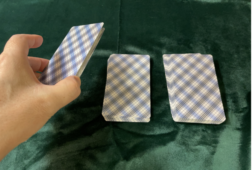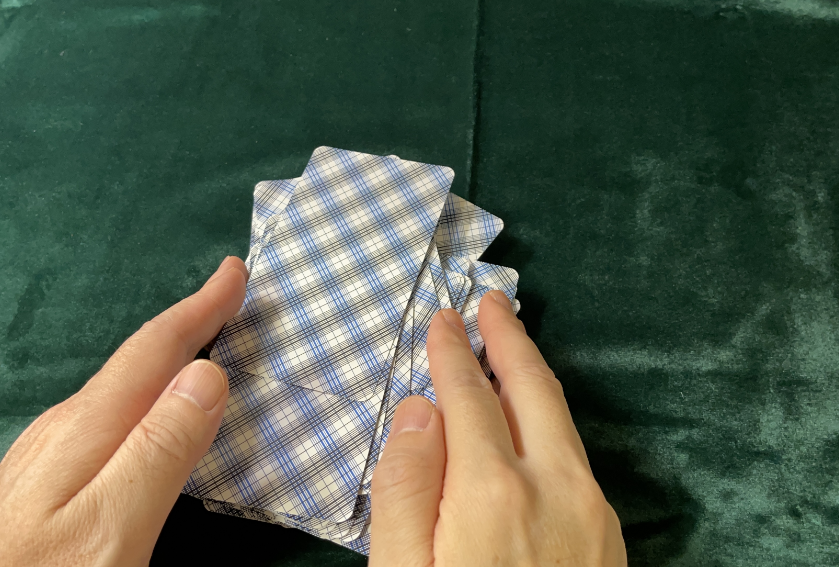 ・占いことを念じながら、左手でカードの山をここだと思えるところで3つにわけて横に並べて、自分がこれだと思えた順番でまたひとまとめの山にします。これをカットと呼びます。