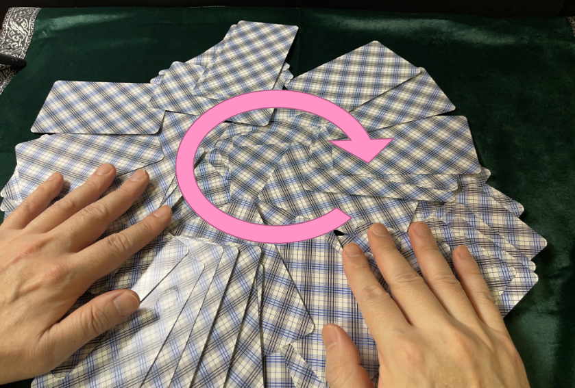 ・シャッフルとは、タロットカードを1つにまとめた山を、占いたいことを念じたり言葉にしながら、山をくずして、時計まわり(右まわり)に混ぜることです。これをシャッフルと呼びます。
